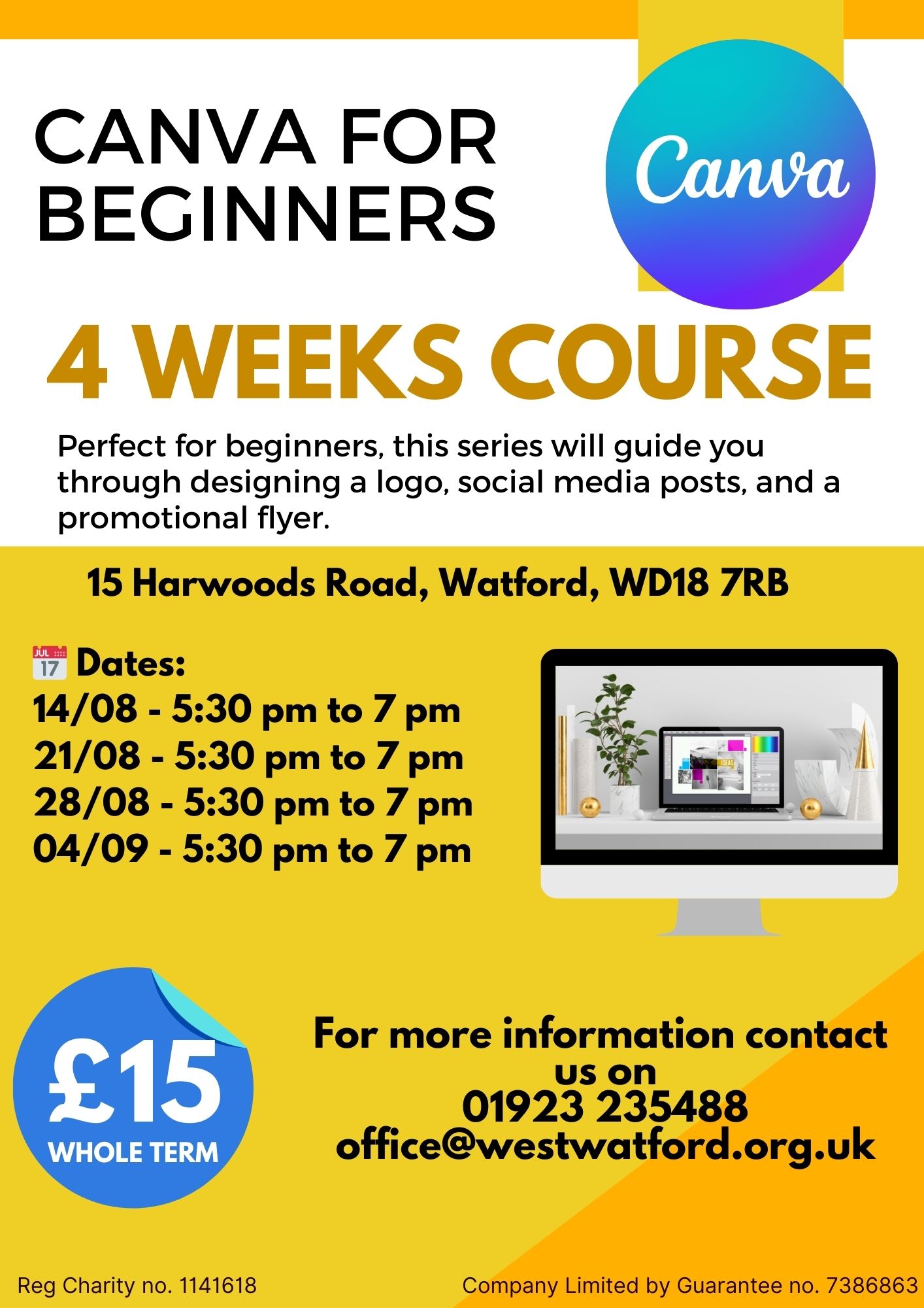 We are excited to invite you to our Canva for Beginners Workshop, starting 14/08/24, 5:30 pm to 7pm. Over four weeks, you will learn to create a logo, Facebook cover photo, Instagram post, and a promotional flyer.