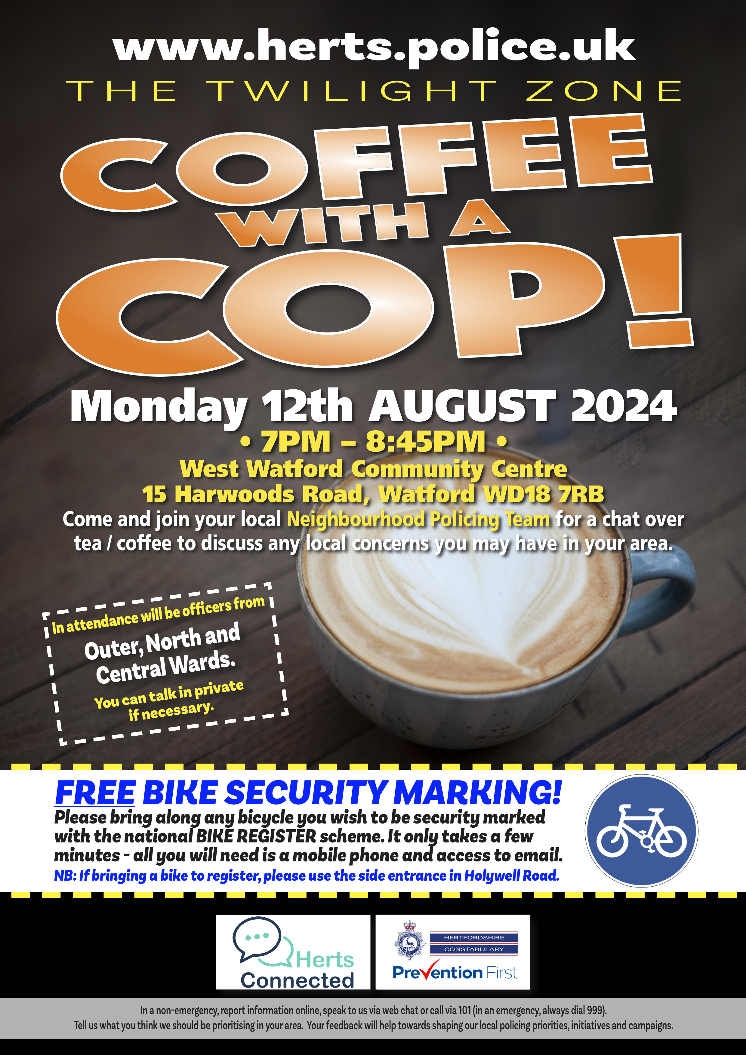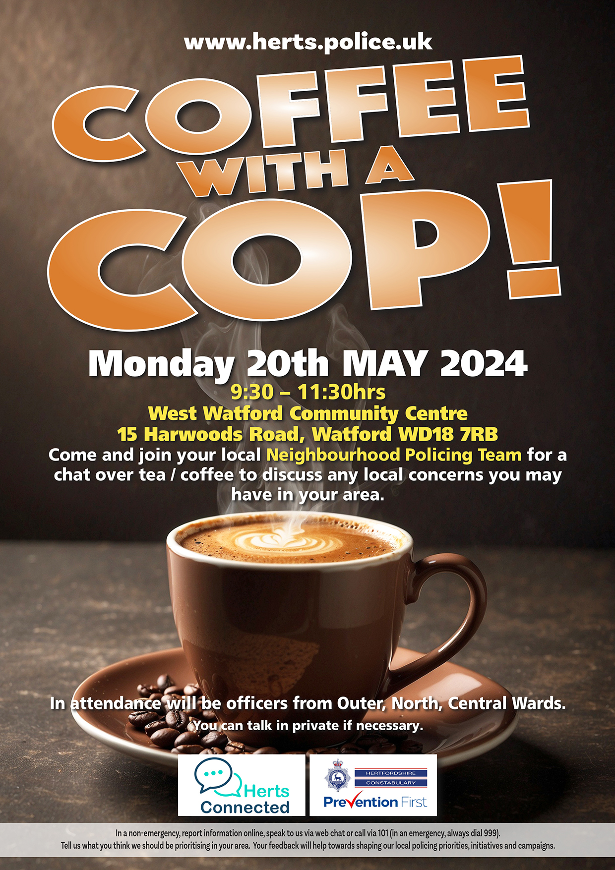 Come and join your local neighbourhood policing team for a chat over tea/coffee to dicuss any local concers you may have in your area.