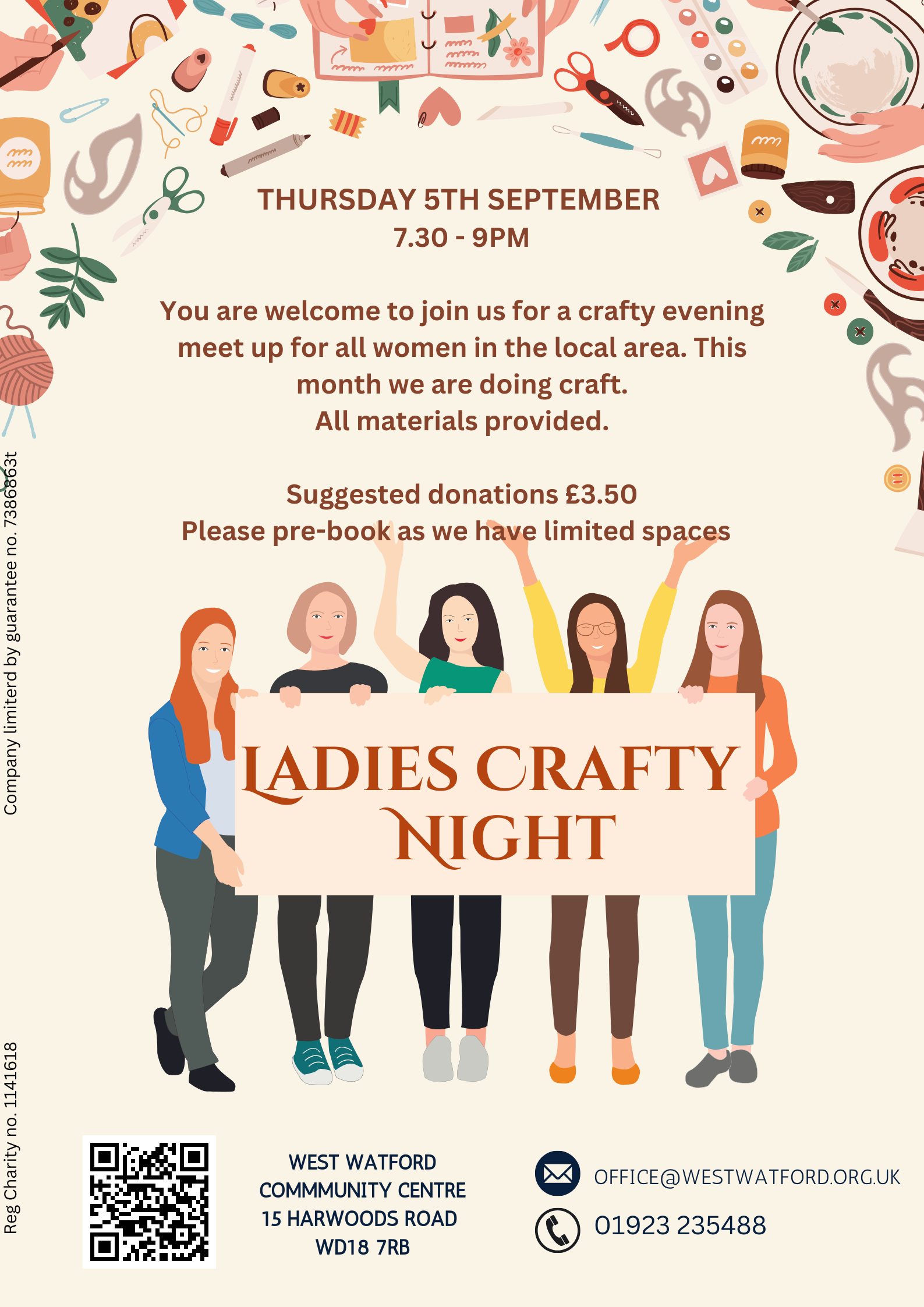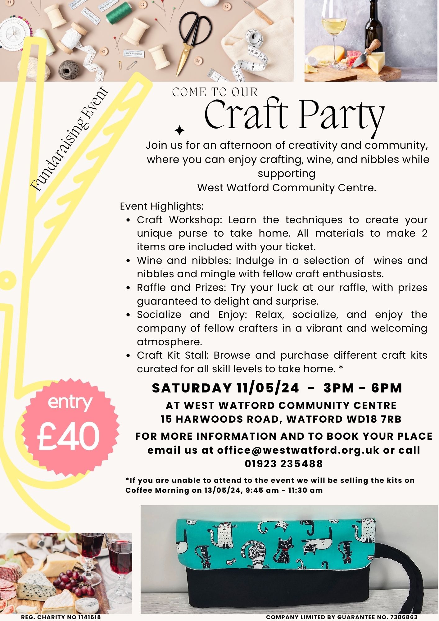 Join our Craft Party, an elegant evening of textile crafts, wine, and nibbles, designed to bring our community together in support of West Watford Community Centre. This event promises to blend the joy of creating with the pleasure of tasting, offering a unique experience that appeals to craft enthusiasts and food lovers alike.