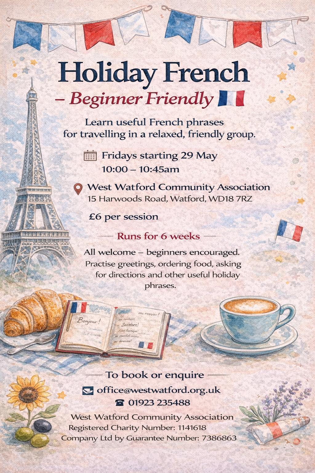Learn useful French phrases for travelling in a relaxed, friendly group. Practice greetings, ordering food, asking for directions and other useful holiday phrases.